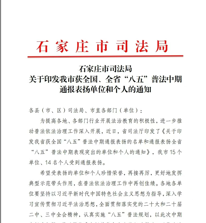 2024年11月,司法部、全国普法办、河北省司法厅先后印发了《关于通报表扬“八五”普法中期突出单位和个人的通知》,石家庄市15个单位14名个人受到通报表扬。
