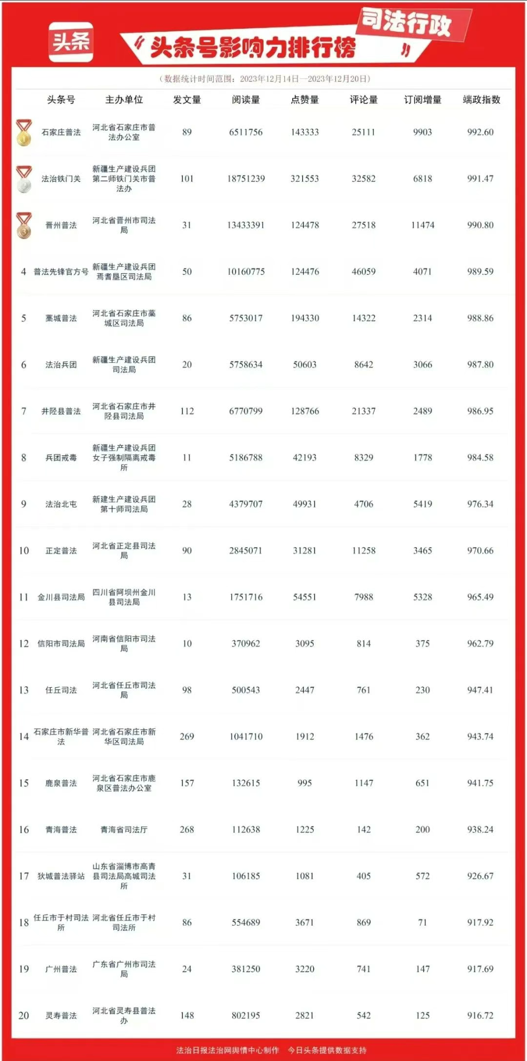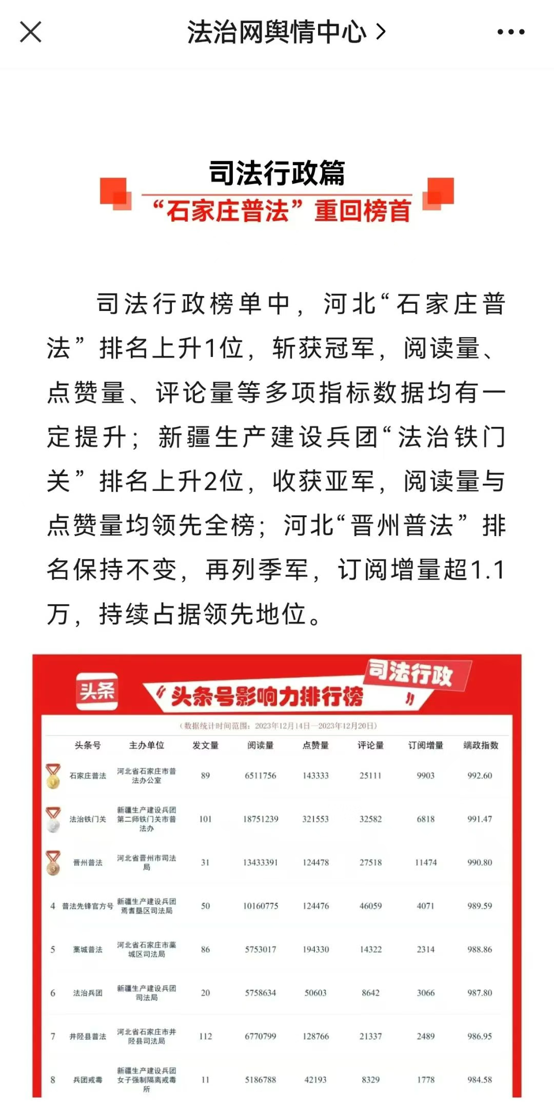 “石家庄普法”头条号、抖音号、微博号、微信公众号全年累计发文1.1万篇,头条号总阅读量达3.6亿人次,全市头条矩阵进入全国榜单463次,持续入选中央政法委新媒体影响力榜单和长安河北排行榜单,宣传效果明显。