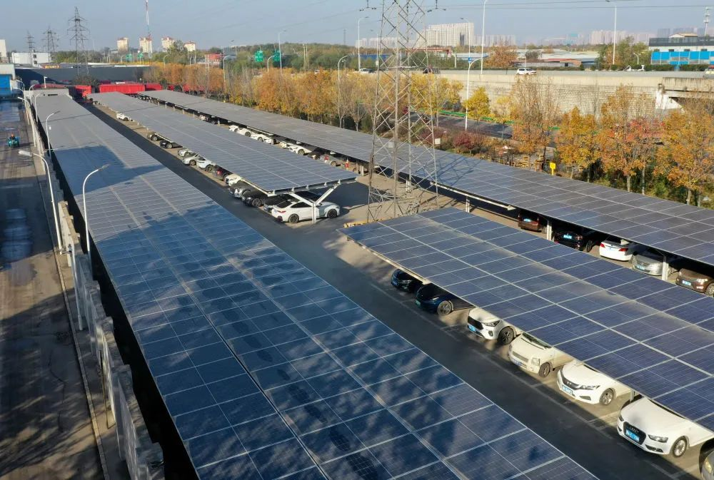 11月27日拍摄的石家庄市栾城区装备制造产业园一家企业停车场顶棚上的光伏发电板(无人机照片)新华社记者 杨世尧 摄