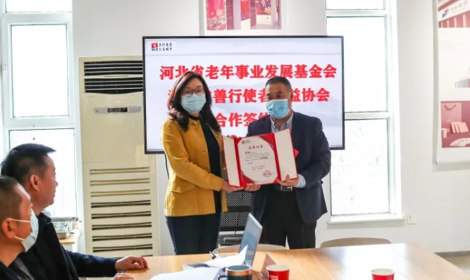 河北省老年事业发展基金会理事长姜文汇与河北省善行使者公益协会会长李洁签订战略合作协议书。秘书长寇炳耀宣布“善行使者·助老健康防疫”项目正式启动。