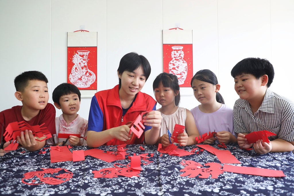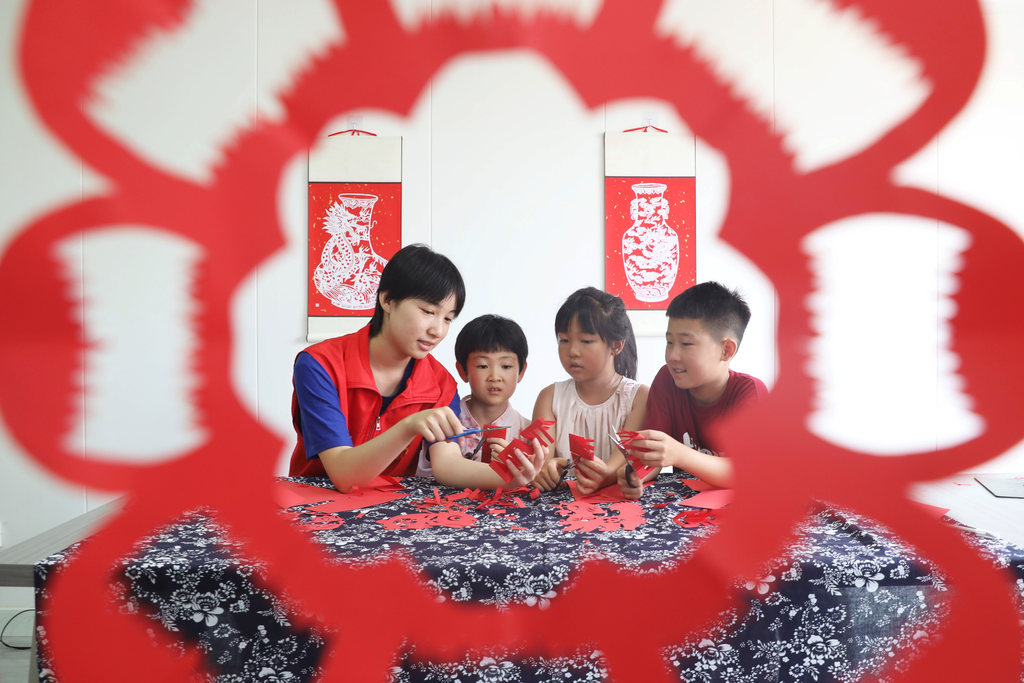 7月11日,唐山市丰润区欣园社区暑托班的孩子们在学习剪纸。