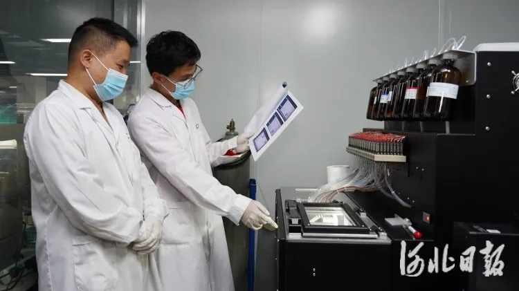 图为在固安县国科赛赋河北医药技术有限公司,工作人员在定量添加试剂。吴迪摄