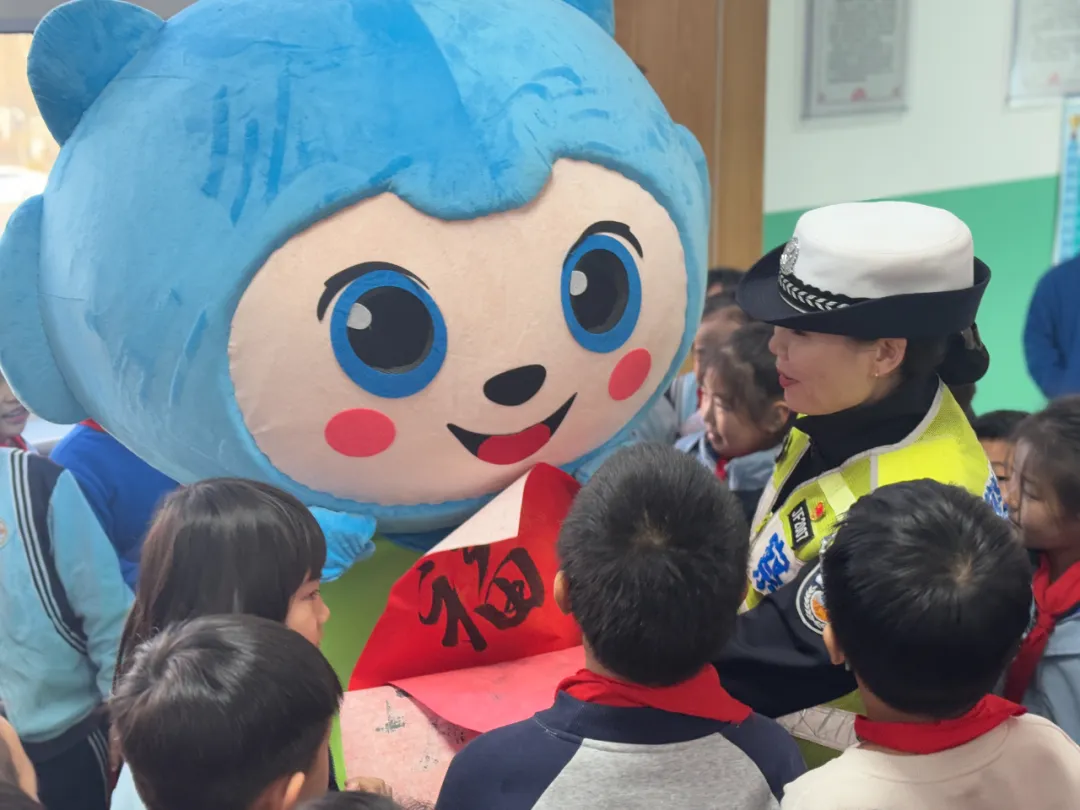 除了交通安全知识讲解,交警和“路宝儿”一起为师生们送上了“福”字和交通安全宣传资料。“福”字寓意着平安幸福,表达了交警对师生们的美好祝愿;宣传资料则涵盖了交通安全的各个方面,为师生们提供了更多的关于交通安全知识的学习资源。