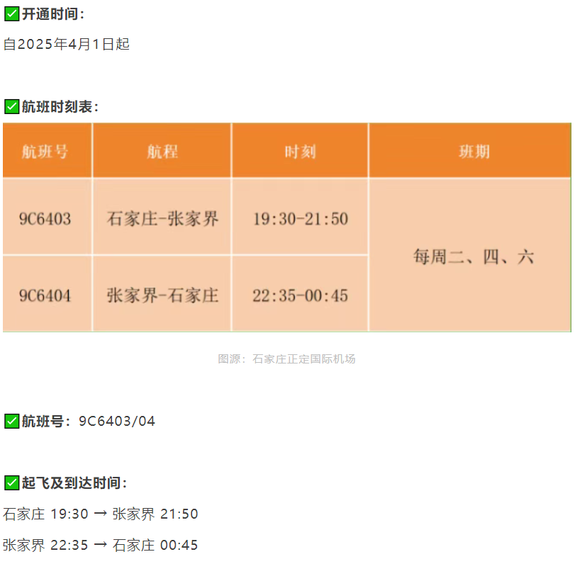 石家庄⇌张家界直飞航线