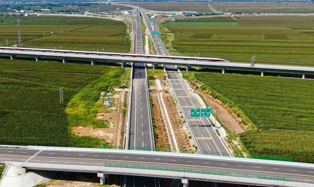 9月9日,邯港高速衡水沧州界至国道G205段穿越京沪高铁项目(无人机照片)。傅新春摄
