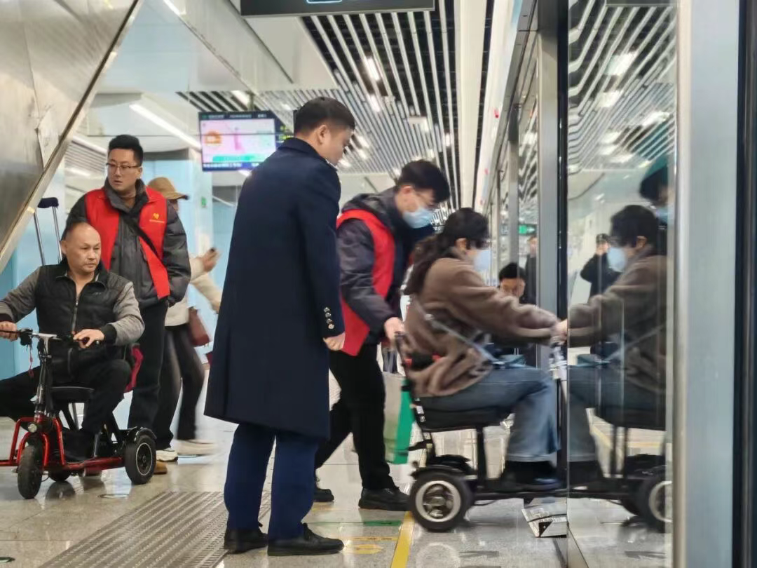 工作人员和志愿者帮助腿脚不方便的旅客上地铁。(石家庄轨道集团供图)石家庄地铁“四线同建” 跑出“加速度”