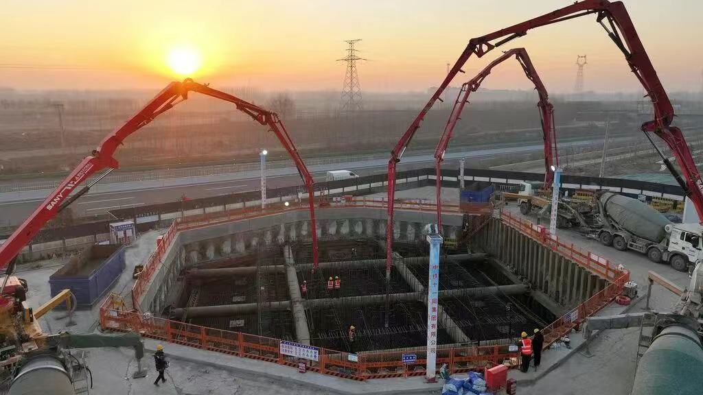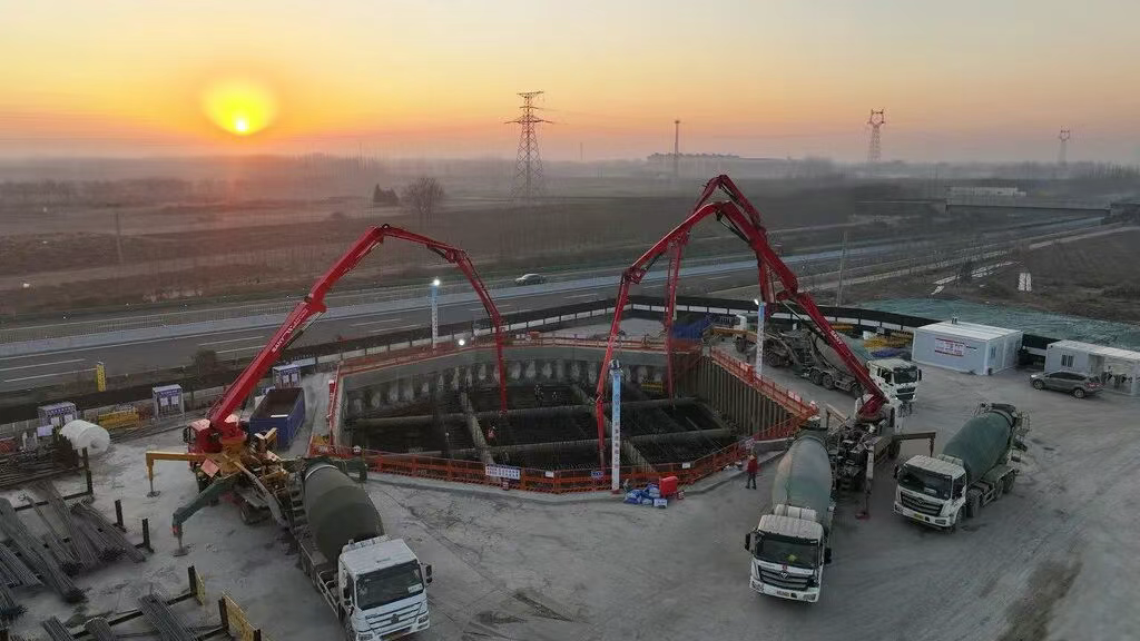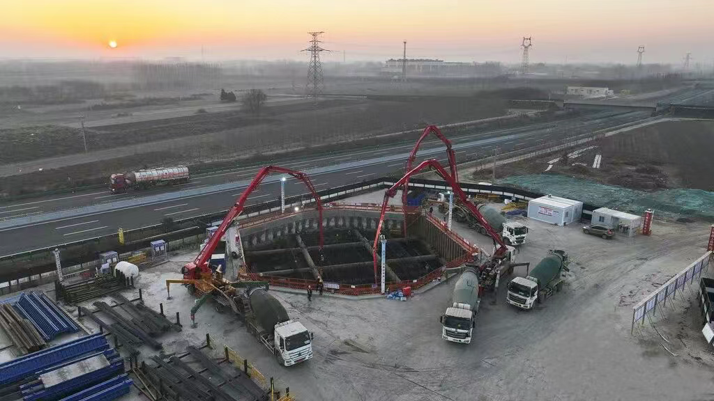 12月6日,中铁十一局建设者在进行石雄铁路跨朔黄铁路特大桥137号主墩承台混凝土浇筑施工。石雄铁路跨朔黄铁路特大桥137号主墩承台