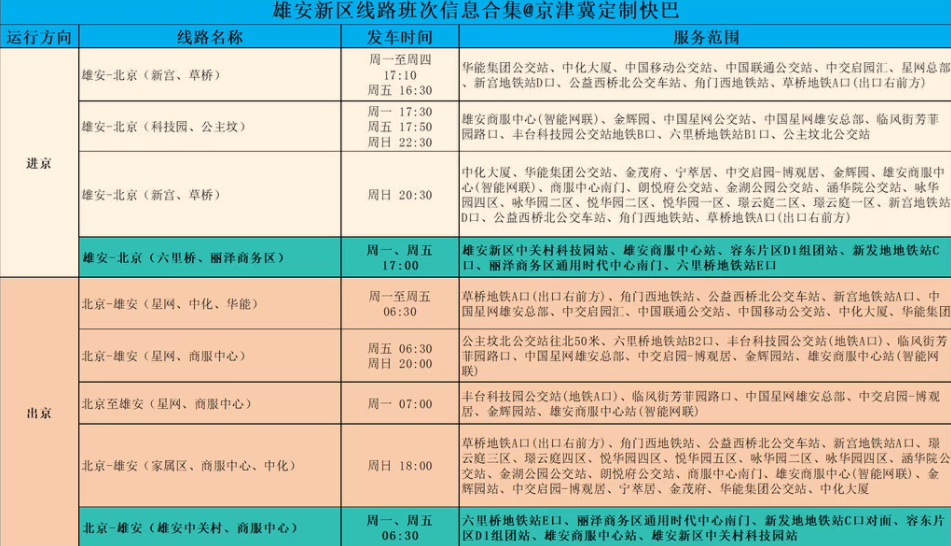 北京往返雄安线路聚焦通勤核心需求,站点覆盖两地关键交通枢纽及人员、产业密集区域。