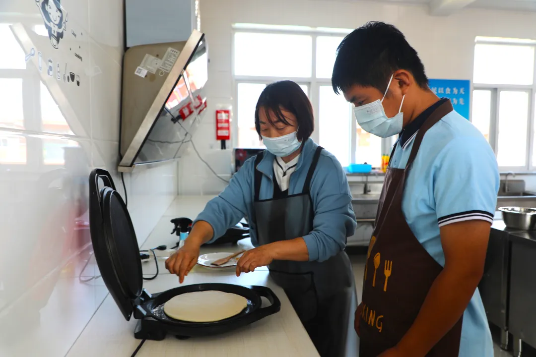 在河北省保定市涞水县特教中心,学生正在上烹饪课