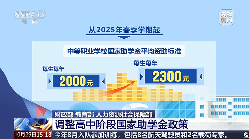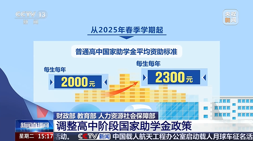 提高普通高中国家助学金资助标准。从2025年春季学期起,将普通高中国家助学金平均资助标准由每生每年2000元提高到2300元,具体标准由各地结合实际在1200—3500元范围内确定,可以分为2—3档。