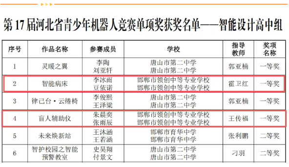 在备受瞩目的“智能设计高中组”一等奖名单中,邯郸市领创中等专业学校的名字与诸多传统强校并列,并且罕见地占据了两席之地。
