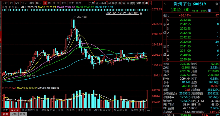 在披露了增速大幅放缓的一季报后,贵州茅台周三低开4%,全日维持窄幅震荡。至当日收盘,贵州茅台报2042元,跌2.5%,为白酒板块跌幅最大的股票;最新市值为2.57万亿,一日蒸发了660.74亿元,相当于一个酒鬼酒(周三最新总市值)。当日白酒板块指数涨4.4%,其中青青稞酒、伊力特(600197.SH)涨停,金徽酒、金种子酒涨逾8%,老白干酒、山西汾酒、ST舍得、酒鬼酒等涨幅居前;茅台为板块内唯一下跌的股票。