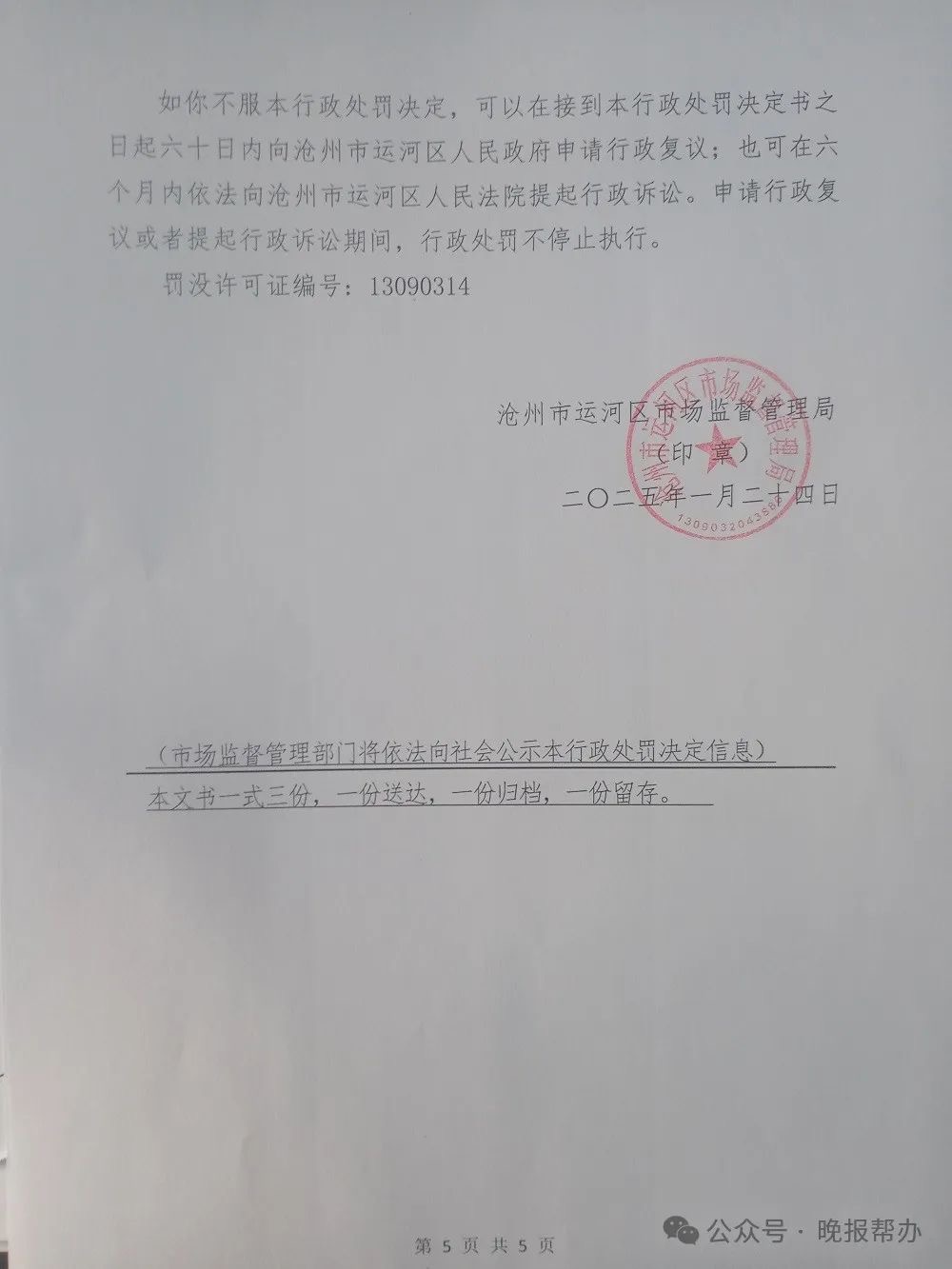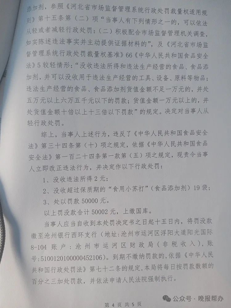 近日,河北省人民政府网站“行政执法公示平台”发布了沧州市运河区市场监督管理局于1月24日作出的“沧运市监处罚〔2025〕028号”行政处罚决定书。2024年11月15日执法人员在沧州市运河区付振军食品店发现待售的“食用小苏打”(食品添加剂)生产日期为2022年5月6日(保质期12个月)共19袋,均已超过保质期。以上行为违反了《中华人民共和国食品安全法》第三十四条第十项的相关规定。沧州市运河区市场监督管理局依据《中华人民共和国食品安全法》第一百二十四条第一款第五项的相关规定,对沧州市运河区付振军食品店作出以下行政处罚:2.没收超过保质期的“食用小苏打”(食品添加剂)19袋;3.处以罚款50000元。