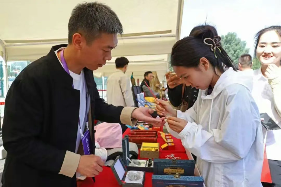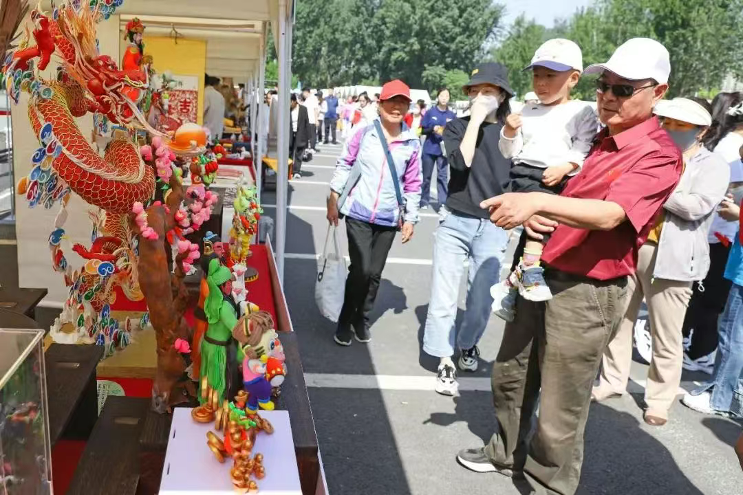 5月18日,在河北省涿州市第九届全民运动会开幕式现场,涿州市38个非遗项目集体进行展演,为赛事增添了别具一格的文化魅力。图为市民参观非遗项目展示。熊华明 摄