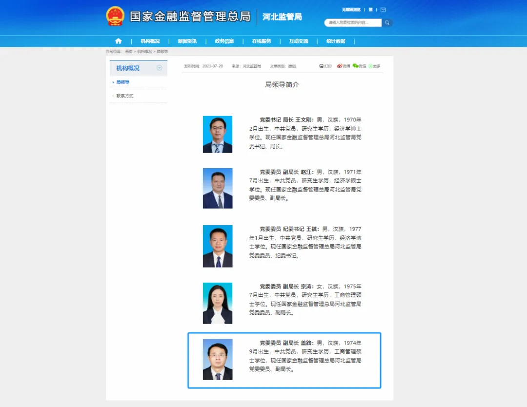 据国家金融监督管理总局河北监管局官网“局领导”一栏显示,盖路已任任国家金融监督管理总局河北监管局党委委员、副局长。