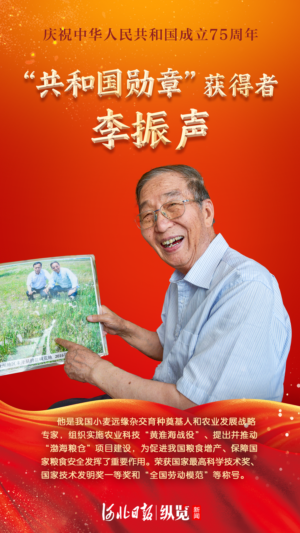 其中李振声先生,36年前,他在包含河北在内的几省份打响农业科技“黄淮海战役”,向盐碱地宣战;11年前,他以河北为主战场,瞄准盐碱地增产,建设“渤海粮仓”。