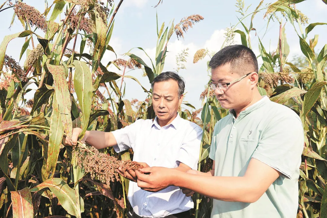 2018年9月10日,刘小京(左)在中科院南大港盐碱旱地丰产高效示范基地内查看高粱长势。(资料片)