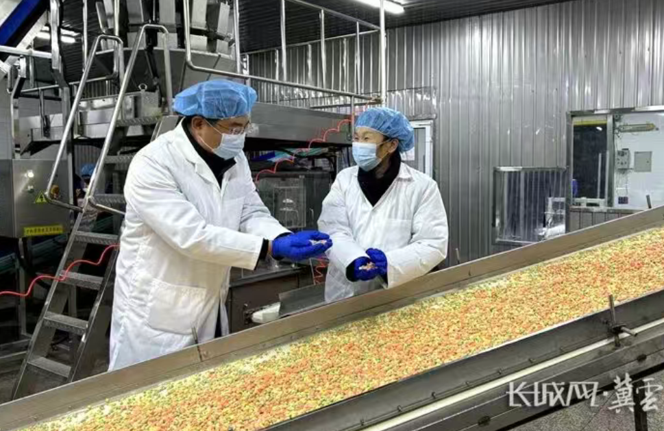 在乐亭县金田果菜有限公司,随着机器轰鸣,已经加工好的玉米粒、豌豆粒等正顺着传送带运送至包装环节。在这里,李瑶仔细观察着每一个细节并不时询问着。