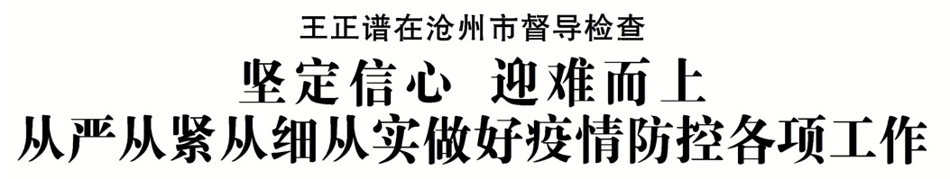 3月16日,省长王正谱在沧州市督导检查时强调,要深入学习贯彻习近平总书记关于疫情防控的重要指示精神,全面落实国务院联防联控机制部署,按照省委、省政府要求,坚定信心、迎难而上,从严从紧、从细从实做好疫情防控工作,在最短时间内实现社会面动态清零,全力维护人民群众身体健康和生命安全。
