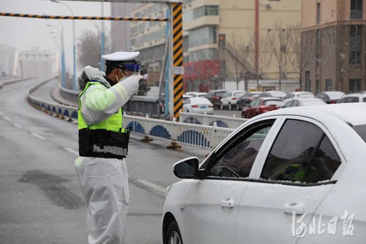 在京泸高速廊坊出入口交通安全防疫执勤点、南尖塔检查站交通安全防疫执勤点,高架桥北交通安全防疫执勤点等多个执勤卡点,900余名民辅警正在风雪中继续严防死守,严格对进入廊坊境内的所有车辆进行登记、筛查、劝返、隔离等工作。