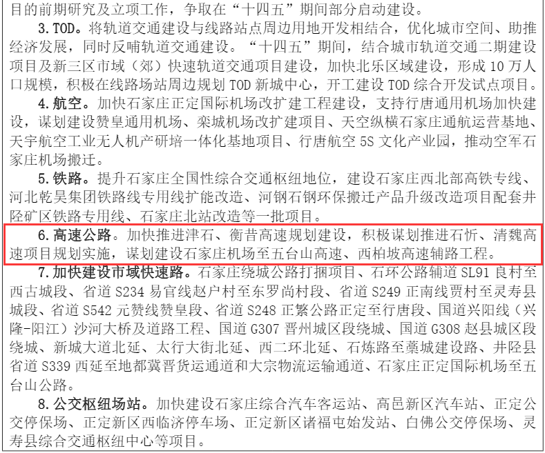 《纲要》中提出,在高速公路方面,要加快推进津石、衡昔高速规划建设,积极谋划推进石忻、清魏高速项目规划实施,谋划建设石家庄机场至五台山高速、西柏坡高速辅路工程。