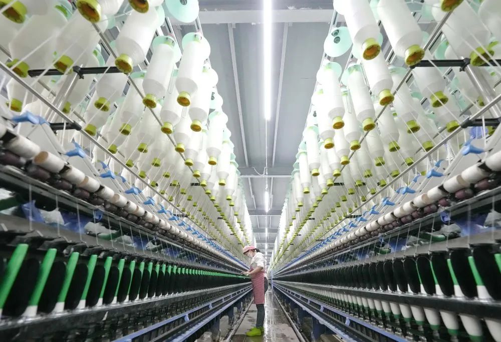 ↑4月9日,工人在河北省青龙满族自治县朱杖子乡朱杖子村一家纺织企业生产车间工作。