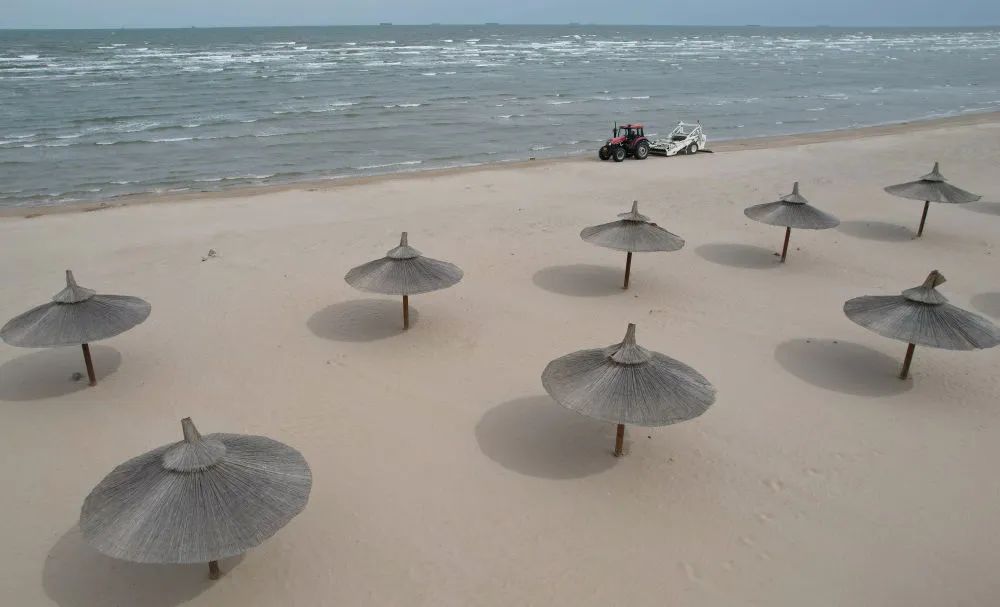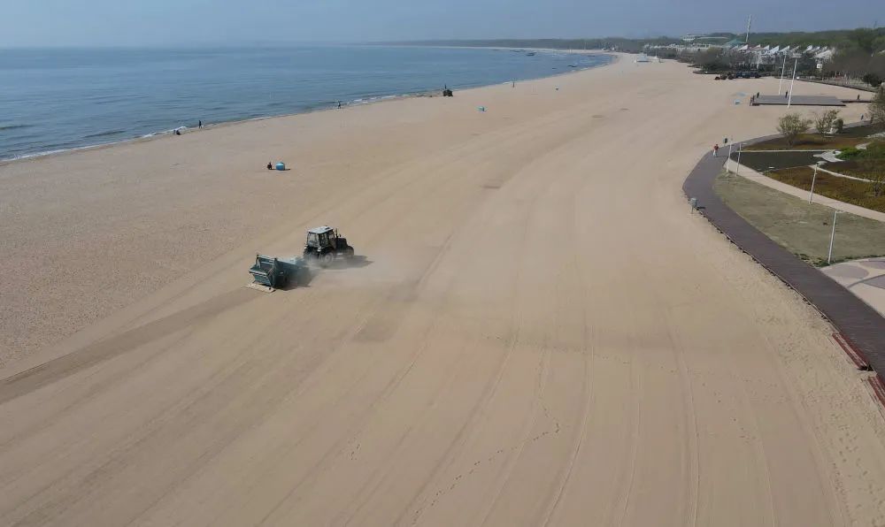 ↑4月23日,工人在秦皇岛市北戴河区浅水湾浴场使用机械设备过滤海滩上的沙子(无人机照片)。