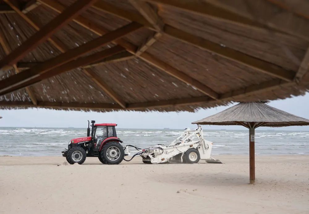 ↑4月23日,工人在秦皇岛市北戴河区浅水湾浴场使用机械设备过滤海滩上的沙子。新华社记者 杨世尧 摄