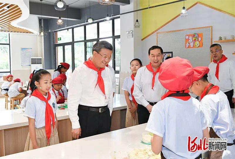 石家庄市新华区柏林庄学校始建于1907年,是一所拥有光荣革命传统的学校。倪岳峰等来到该校,看望慰问少年儿童。少先队员为倪岳峰等佩戴红领巾,并引领参观校史长廊,介绍学校百年历程。在劳动实践馆,倪岳峰观看“劳动最光荣”烹饪实践暨“柏小厨”大赛展示,鼓励孩子们勤于动手、勇于实践,从小养成爱劳动的好习惯。在美术馆,“这么近,那么美,周末到河北”主题绘画获奖作品展和“非遗小工匠”学生錾刻活动正在举行,倪岳峰兴致勃勃地参观,希望孩子们知家乡、爱家乡,当好宣传河北的小使者。在创客空间,倪岳峰饶有兴致地观看“我是小小科学家”科技活动,勉励孩子们增强探索精神,提高能力本领,将来为强国建设、民族复兴贡献智慧和力量。在学校操场,倪岳峰观看了旱地冰球、足球、篮球等体育训练,叮嘱孩子们坚持运动,强健体魄,砥砺意志,争做德智体美劳全面发展的好少年。在学校报告厅,课本剧《黄继光》正在紧张彩排。倪岳峰等认真观看,为孩子们精彩感人的表演点赞。