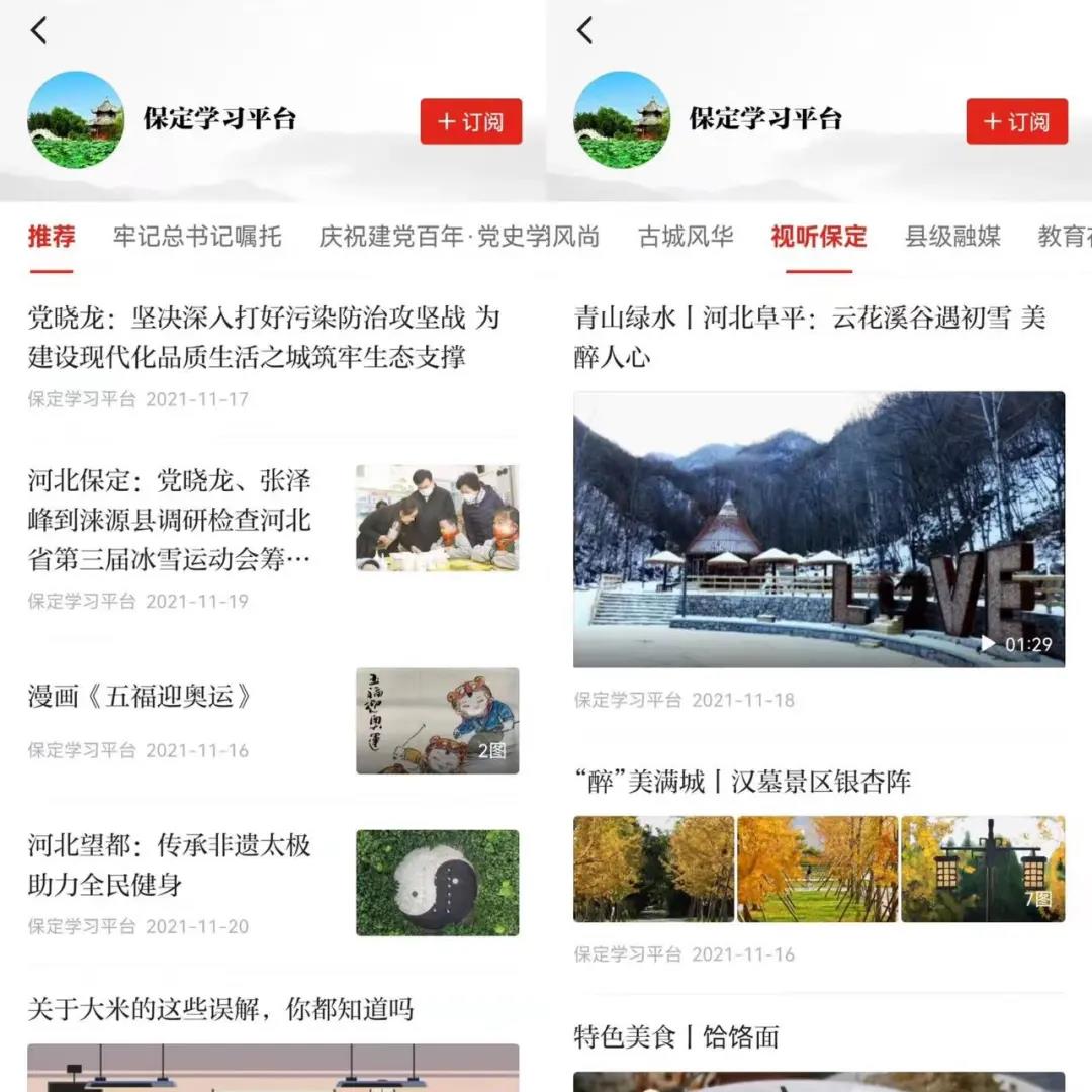 “学习强国”保定学习平台APP端共开设“推荐”“牢记总书记嘱托”“庆祝建党百年•党史学习教育”“品质生活之城”“权威媒体看保定”“民生关注”“文明风尚”“古城风华”“视听保定”“县级融媒”“教育在线”“专题集萃”等12个频道,采用图文、图集、视频、音频等多种方式,为广大党员干部群众提供权威、准确、丰富、新颖的学习内容,多维度展现习近平新时代中国特色社会主义思想在保定的生动实践和经验做法,展示广大党员干部在全面建设现代化品质生活之城中的担当作为,为激情奋进“十四五”、再造一个新保定凝聚磅礴力量。