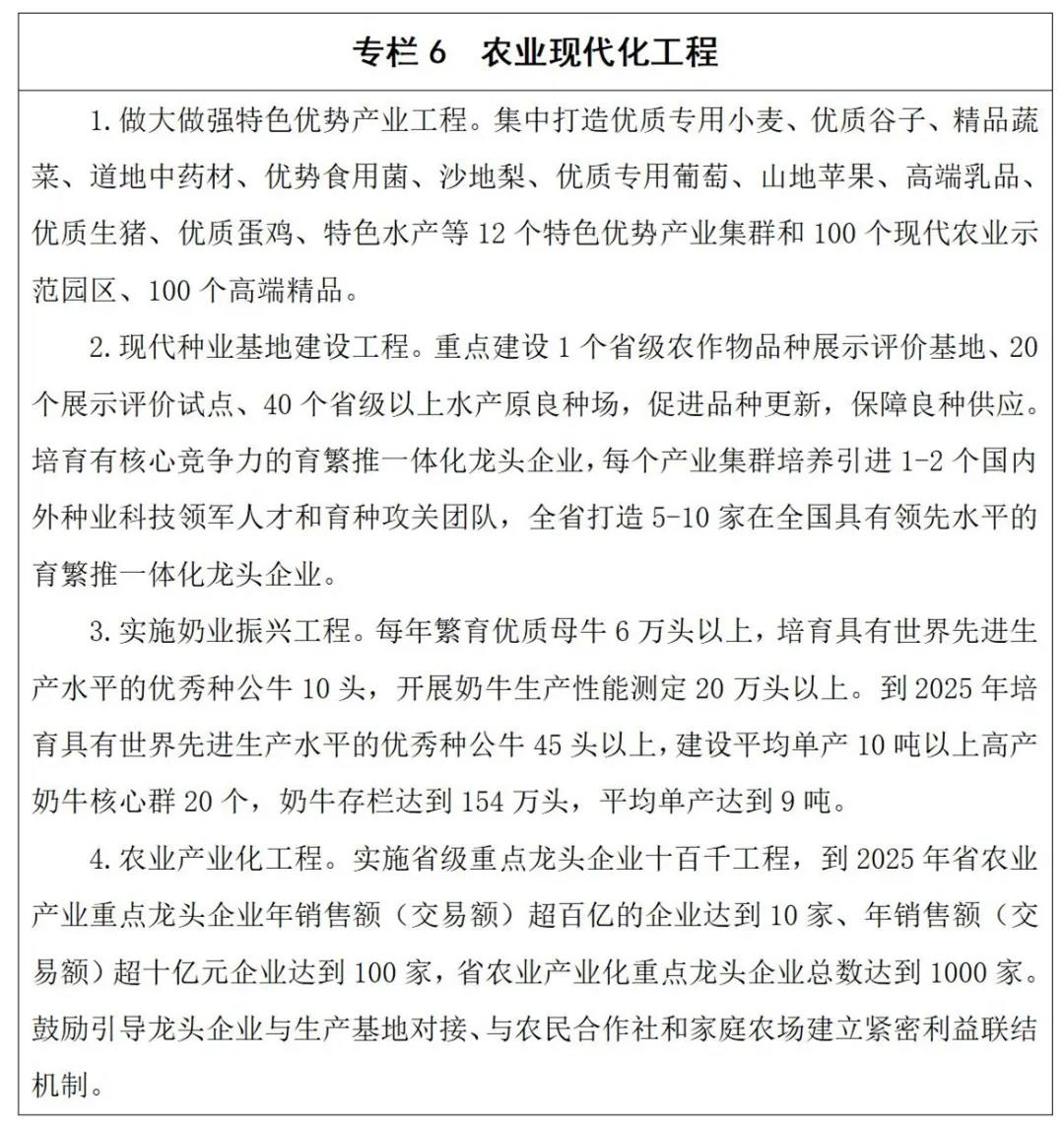 4.食品产业。着力增品种、提品质、塑品牌,加快农产品资源大省向食品产业强省转变。重点发展粮油加工、乳制品、方便食品、饮料和酒等四大产业,稳定面粉、食用油、乳制品等基础加工产业规模,巩固乳制品、方便面、天然色素提取物等领域领先地位,大力发展粮油加工产品、高端特色乳制品、焙烤及休闲食品、大众厨房食品、功能食品、调理食品、优质酒和健康饮料产品等,建设覆盖全面、产能匹配、水平先进的食品加工产业体系。积极发展精深加工,推广应用先进加工装备、工艺技术,提高加工效率、提升工艺水平、保障产品质量;鼓励开发优质化、多样化、个性化、定制化粮油产品,大力发展蛋白肽、谷朊粉、变性淀粉及衍生物等精深加工产品,支持发展奶酪、黄油、乳清粉、乳铁蛋白等高端乳制品,科学发展功能饮料、婴幼儿配方乳粉、特殊医学用途配方食品、酒庄酒及专用酒等,加快形成高端、高附加值产品群。切实保障质量安全,完善和提升农产品和食品质量标准,引导和支持农副产品标准化生产,支持企业建设标准化原料基地,推广先进质量管理模式,建立首席质量官制度,推进食品企业HACCP和诚信管理体系认证,建立健全食品安全追溯体系,完善食品安全监管风险防控体系,落实失信联合惩戒机制,打造食品安全标杆省。着力优化产业发展模式,着眼品质管控和产业规模化、集约化,支持大型农业产业化企业、食品加工龙头企业发展,开展从原料到终端产品的一体化经营,完善“种植养殖—产品研发—生产加工—产成品”的产业链条,建立生产加工—物流供应—消费服务闭环产业体系,创新和优化食品产业经营模式。