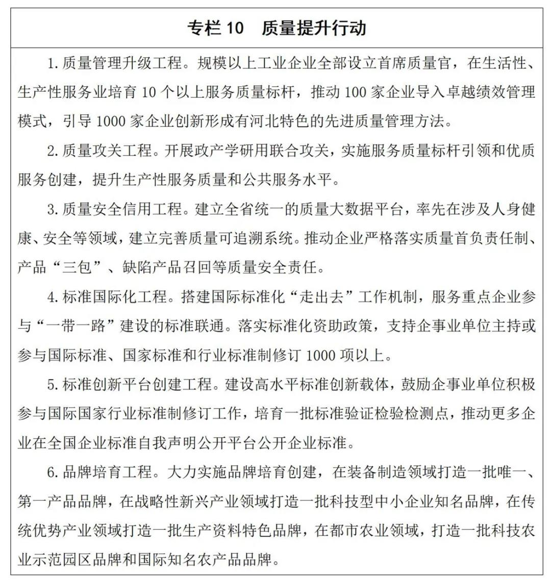 4.着力打造诚信河北。完善质量法规制度体系、政策规划体系和质量管理法规规章体系,强化“双随机、一公开”等新型监管机制,推动形成政府主导、企业主责、社会参与的质量工作格局。强化企业质量主体地位,严格企业质量安全管理,推广产品质量保险,落实缺陷产品召回、质量担保等法定义务,全面推行首席质量官制度。加强财政、金融等质量激励政策,引导企业争创中国质量奖、省政府质量奖,对获奖企业在金融、项目投资等方面,给予政策支持和资金激励。加强质量安全监管,开展质量安全风险监测评估,严厉打击假冒伪劣行为。完善质量诚信体系,完善全国企业信用信息公示系统(河北)和全国信用信息共享平台(河北),建立健全企业质量信息公示制度,严格执行企业严重违法失信名单管理,依法依规对质量违法失信企业实施联合惩戒。开展质量宣传活动,加强质量社会监督和舆论监督,畅通质量维权渠道,创建河北质量文化,营造良好质量环境。