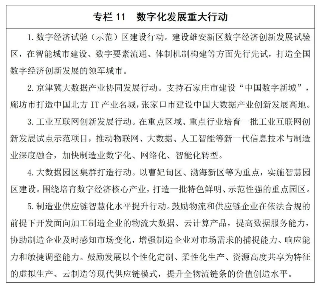 1.推动数字经济与实体经济深度融合。加快建设信息网络基础设施。推进网络设施IPv6升级改造,加快5G网络覆盖和商用推广,完善新一代光纤网络,推进有线广播电视网络双向化、数字化、智能化改造,优化互联网数据中心(IDC)布局,建设全国一体化算力网络京津冀国家枢纽节点,加快构建工业互联网网络体系,改造升级省级北斗导航系统,规划建设低轨卫星互联网地面信关站。布局建设窄带物联网基础设施和应用平台,加快公交、路网、管网等传统基础设施数字化改造,推动信息基础设施向乡村延伸,全面增强数字化基础支撑能力。