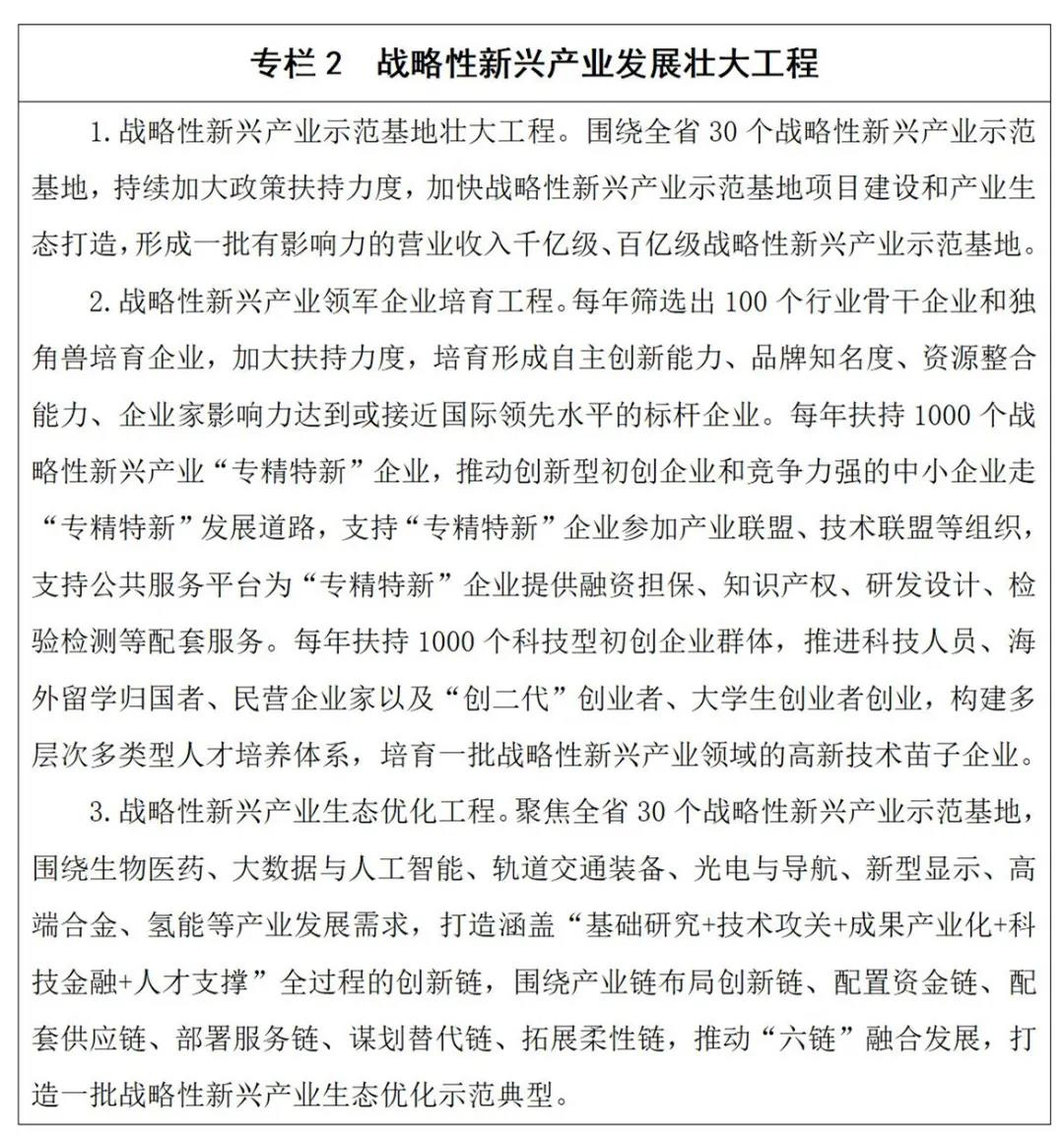 (二)发展壮大战略性新兴产业。聚焦信息智能、生物医药健康、新材料、新能源等重点领域,坚持高起点、高水平、规模化发展,扩大产业规模、丰富产品种类、构筑产业链条、增强竞争实力,加快建设具有重要地位和市场影响力的新兴产业集群。