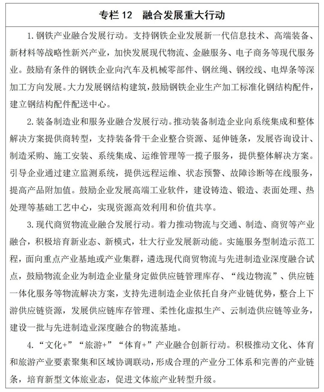 2.推动先进制造业和现代服务业深度融合。发展服务型制造。加快原材料工业和服务业融合步伐,推动原材料企业向产品和专业服务解决方案提供商转型,加强早期研发介入合作,提供定向开发服务,支持有条件的企业提供社会化能源管理、安全环保、信息化等服务,支持具备优势的企业发展废弃物协同处置、资源循环利用、污水处理、热力供应等服务。推动消费品工业和服务业深度融合,在服装、家居等领域发展规模化、个性化定制,在家电、手机、新型终端等领域开展“产品+内容+生态”全链式智能生态服务,在家电、消费电子等领域健全废旧产品回收拆解体系。提升装备制造业和服务业融合水平,推动装备制造企业向系统集成和整体解决方案提供商转型,通过市场化兼并重组培育总承包能力,发展辅助设计、系统仿真、智能控制等高端工业软件,建设铸造、锻造、表面处理、热处理等基础工艺中心,加快重大技术装备创新,带动配套、专业服务等产业协同发展。完善汽车制造和服务全链条体系,推动汽车智能化发展,加强车况、出行、充放电等数据挖掘应用,加快充电设施建设布局,探索发展换电和电池租赁服务,建立动力电池回收利用管理体系,规范发展汽车租赁、改装、二手车交易、维修保养等后市场。加强新能源生产使用和制造业绿色融合,推进新能源生产服务与设备制造协同发展,推广智能发电、智慧用能设备系统,发展分布式储能服务,加强工业设备、智能家电等用电大数据分析,完善氢能制备、储运、加注等设施和服务。