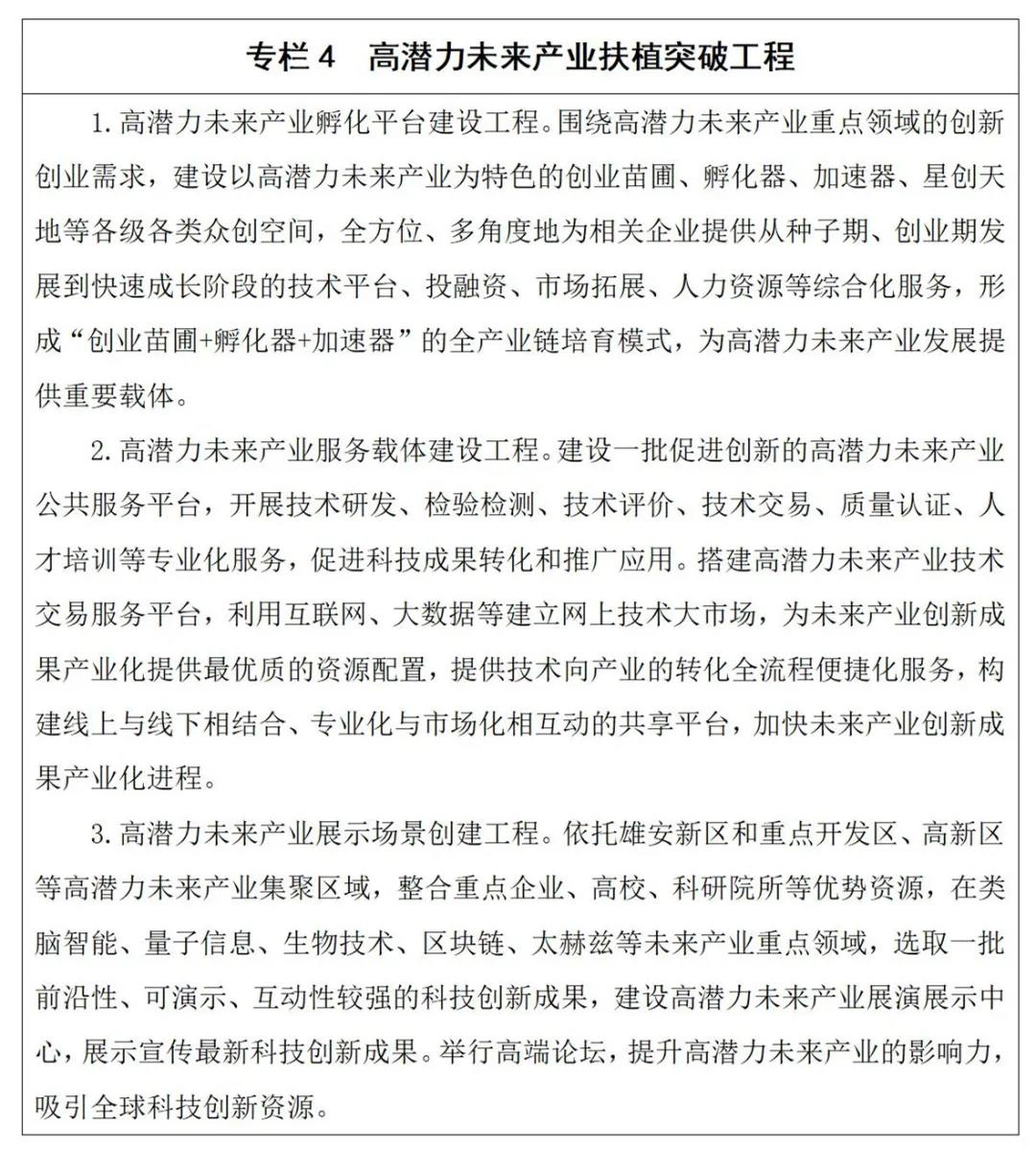 4.未来产业。围绕类脑智能、量子信息、生物技术、区块链、太赫兹等重点领域,加强谋划布局和产业孵化,加快产业突破,打造未来产业发展先行区、新高地。导入前沿技术,紧盯新一轮科技革命和产业变革趋势,组织推进科技前沿攻关和前沿技术引进,动态实施重大科技成果转化计划,滚动支持一批产业化项目。布局前瞻性产业,以人工智能、新一代互联网、AR/VR、基因技术等为重点,引进培育一批头部企业,推动一批核心技术向产品转化,实现从0到1突破,协同京津打造前沿产业链。培育颠覆性产业,以太赫兹、区块链、量子通信、碳基芯片等为重点,推动创新成果产业化落地,形成一批先导性产品,完善产业链上下游配套,发展颠覆性产业集群。