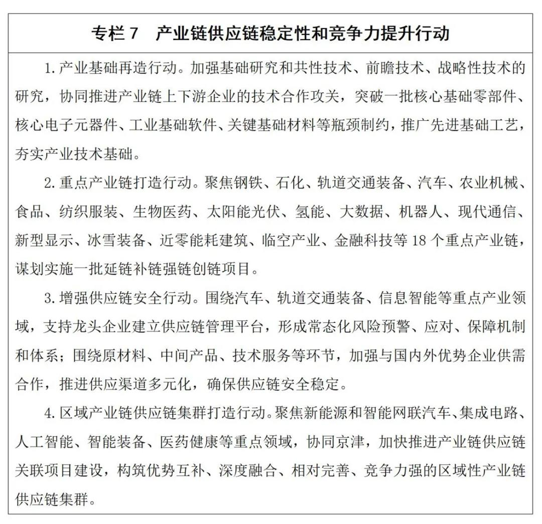 4.提升产业链供应链协同合作水平。打造京津冀一体化产业链体系。按照“瓣瓣不同、却瓣瓣同心”的总要求,根据我省在京津冀区域功能定位,与京津产业错位发展、互补发展,协同打造产业链集群、产业链生态,有效提升域内产业链整体竞争力。加快雄安新区集中承载地建设,依托5个协同协作平台、4个特色专业平台、33个个性化平台,加快落实产业对接、承接产业转移成果,推动一批高端装备、大数据中心、电子信息、生物医药、商贸物流等产业项目落地。对接京津产业发展“十四五”规划,协同谋划产业发展布局,全面完善区域协同产业链,共同建设重点产业链生态体系,一体化打造世界级先进制造产业集群。