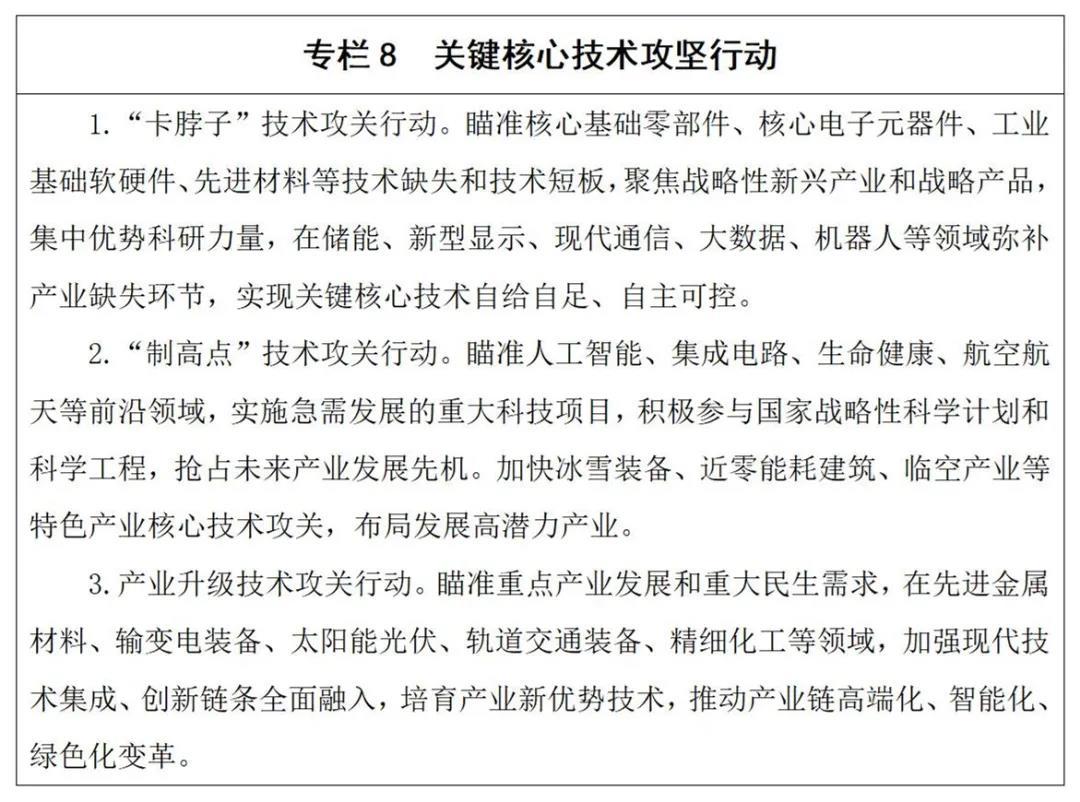 2.强化关键核心技术攻关。围绕产业链部署创新链。突出主导产业、重点产业链,瞄准制约产业链稳定性和竞争力核心环节、关键短板,系统性整合创新资源,加大创新投入,聚集精锐创新力量,打造一批研发创造、商品化、社会效用化各环节相对完整的创新链条,形成科技攻关能力体系。围绕先进金属材料、输变电设备、太阳能光伏等传统优势领域和氢能、现代通信、机器人、生物医药等新兴领域,部署一批共性先进技术、关键核心技术创新链,推动制造业产业链价值提升。围绕区块链、人工智能、合成生物等前沿领域,超前部署产业化研究,加快建设应用场景,形成自主可控、协同高效、具有较强竞争力的创新链。围绕京津冀具有协作优势的战略性新兴产业领域,对接京津创新资源,创新合作机制,打造若干京津冀科技协同创新链。