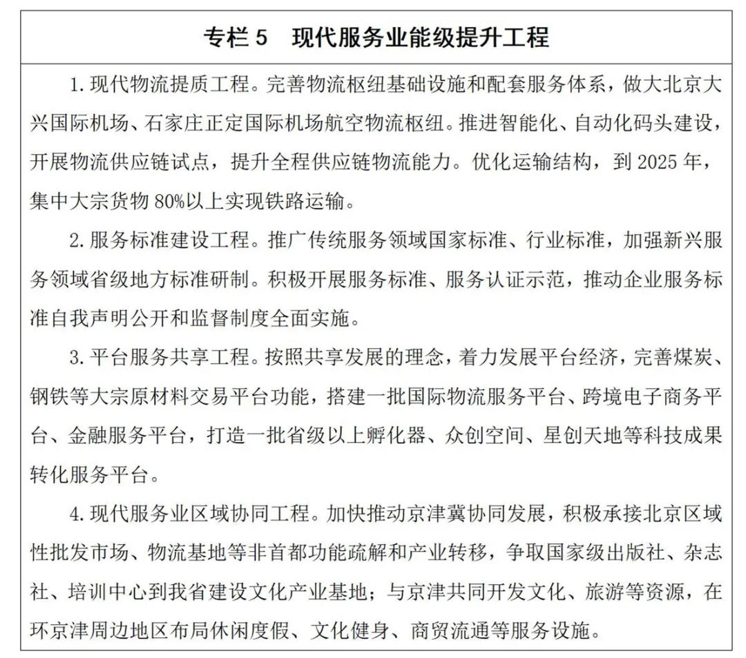 1.现代商贸物流。全面提升商贸物流业现代化、智慧化、绿色化、国际化水平,加快构建立足京津冀、融合城乡、辐射全国、链接全球的现代商贸物流体系,建设全国现代商贸物流重要基地。加强国际国内物流大通道建设,完善港口集疏运体系,拓展国际物流航线,推进中欧国际货运班列图定化运营。抓好唐山市港口型(生产服务型)国家物流枢纽建设,推进石家庄、保定、邯郸、秦皇岛、沧州等国家物流枢纽承载城市建设,推进生产资料批发市场和传统商贸流通企业改造升级,与生产基地、产业聚集区、物流园区加强对接合作,建设流通枢纽节点。大力发展公铁空水多式联运,持续推进“公转铁”“公转水”,推动物流行业信息化、可视化发展,推进车货运站协同联动,推广应用智能运载装卸设备,建设完善物流公共信息、数据交换和在线监管平台。畅通“农产品进城、工业品下乡”通道,持续推进快递行业“两出一进”工程,健全县、乡、村三级物流寄递体系,实现全省行政村快递服务100%全覆盖。优化城乡商业网点布局,持续改造提升传统商业形态和步行街,抓好便民市场建设,推动建设城市“一刻钟”便民生活圈,打造一批特色商贸小镇、智慧街区和“智慧商圈”。推动商贸流通行业品牌化、标准化发展,提升购物、餐饮等传统业态,布局体验式、互动式新兴业态,培育发展特色品牌、非遗技艺和老字号,引进培育发展品牌连锁便利店。推动传统流通企业线上线下一体化发展,持续推进冀商触网行动,抓好国家级电子商务示范城市、国家级示范基地和示范企业的创建,加强唐山、石家庄、雄安新区跨境电子商务综合试验区建设。培育发展夜间经济,打造一批试点示范街区。