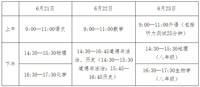 河北省教育厅关于做好2025年初中学业水平考试工作的通知 各市(含定州、辛集市)教育局,雄安新区教育局: 为落实《河北省教育厅关于进一步完善高中阶段学校考试招生制度的通知》(冀教基〔2022〕12号)要求,确保2025年全省初中学业水平考试安全、平稳、顺利举行,现就有关工作通知如下。 一、九年级学生初中学业水平考试 (一)考试对象 2022年入学,应于2025年毕业的初中学生。 (二)考试内容 1.文化课考试满分614分 (1)考试科目。语文120分、数学120分、外语120分(其中听力测试30分,笔试90分)、道德与法治60分(含民族团结进步教育内容)、历史60分、物理68分(其中书面笔试60分,实验操作技能考试8分)、化学66分(其中书面笔试60分,实验操作技能考试6分)。 (2)命题依据。文化课考试以2022年版义务教育各学科课程标准为命题依据。除课程标准规定的教学内容外,道德与法治科目命题范围还包括《中华民族大团结(供初中使用)》和2024年4月至2025年3月间的国内外重大时事政治。 (3)考试形式。根据各学科课程特点,分类采取不同的考试方式:语文、数学、外语(含听力测试)、物理书面笔试、化学书面笔试为全闭卷形式;道德与法治、历史为全开卷形式,采用合场分卷的形式进行考试,考试总时长为135分钟,每科各60分钟,中场换卷15分钟。各科考试均在答题卡上作答。其中,选择题要求考生用2B铅笔将答案填涂在答题卡上,非选择题要求考生用黑色字迹的签字笔将答案书写在答题卡上。 在道德与法治、历史科目开卷考试中,考生可携带相关课程的教科书进入考场,其他资料不得带入考场。答卷时可以查阅准许携带的教科书,独立答题,不得相互讨论、抄袭或相互借阅教科书。 (4)其他要求。普通高中学校、招收学前教育专业公费师范生的院校、中等职业学校和中等技工学校招生使用同一套试卷。 2.体育与健康考试满分50分 体育与健康考试按照《河北省教育厅关于印发〈河北省初中学业水平体育与健康科目考试方案(2024年修订)〉的通知》(冀教体卫艺〔2024〕1号)进行,分为过程性考核和现场测试两部分。 (1)过程性考核满分20分。由学生日常参与体育锻炼情况、《国家学生体质健康标准(2014年修订)》测试成绩、体育与健康课成绩考核三部分组成。 (2)现场测试满分30分。包括必考项目、抽考项目、选考项目三类。现场测试项目成绩评定按照《河北省教育厅关于印发〈河北省初中学业水平体育与健康科目考试现场测试办法(2024年修订)〉的通知》(冀教体卫艺〔2024〕2号)要求进行。体育与健康现场测试于2025年5月底前进行。 二、八年级学生初中学业水平考试 (一)考试对象 2023年入学,应于2026年毕业的初中学生。 (二)考试科目 1.地理满分60分。以2022年版义务教育地理课程标准为命题依据。地理学业水平考试采取全闭卷笔试形式,在答题卡上作答。其中,选择题要求考生用2B铅笔将答案填涂在答题卡上,非选择题要求考生用黑色字迹的签字笔将答案书写在答题卡上。 2.生物学满分66分。其中全闭卷笔试60分,实验操作技能考试6分。以2022年版义务教育生物学课程标准为命题依据。笔试在答题卡上作答。其中,选择题要求考生用2B铅笔将答案填涂在答题卡上,非选择题要求考生用黑色字迹的签字笔将答案书写在答题卡上。实验操作技能考试由各市按照《河北省教育厅关于进一步完善高中阶段学校考试招生制度的通知》(冀教基〔2022〕12号)附件2《河北省初中学业水平物理、化学和生物学实验操作考试方案》要求组织。 3.信息科技满分10分。由各市按照《河北省教育厅关于印发河北省初中学业水平信息科技考试方案的通知》(冀教基〔2023〕5号)要求组织。 三、考试组织 (一)考试时间。河北省2025年初中学业水平考试笔试时间安排为: (二)考试评卷。2025年全省初中学业水平考试文化课考试一律实施网上评卷,由各地市教育行政部门组织实施。各地要按照《河北省教育厅关于印发<河北省初中毕业生升学文化课考试网上评卷管理办法>的通知》(冀教考〔2023〕7号)文件规定做好评卷工作,确保评卷工作严密规范,考试结果客观公正。 四、严格规范考试成绩发布 各地教育行政部门和招生考试机构要严格执行我省初中学业水平考试(以下简称中考)成绩发布的有关要求,应于7月2日-7月4日期间发布成绩,不得向初中学校提供中考成绩;不得向初中学校下达升学指标;不得统计公布各县(市、区)及所属初中学校的升学人数、升学率;不得以中考成绩对各县(市、区)及初中学校进行排名排队;不得以任何形式对各县(市、区)及初中学校进行中考表彰奖励;不得以中考成绩为标准奖惩局长、校长、教师等。初中学校不得宣传中考分数、中考排名、中考“状元”、中考升学率等,不得在校内外任何位置摆放、悬挂、张贴关于中考成绩的条幅、宣传板等宣传物品,不得在学校官网等网站发布本校中考分数、中考排名、中考“状元”、中考升学率等信息。 五、保障特殊群体平等考试升学权利 (一)保障残疾学生公平参与考试权利 对持有残疾人证的听力障碍学生,经本人申请,县(市、区)教育行政部门认定,可以免外语听力测试,其外语成绩按笔试成绩折算成满分值。 (二)保障随迁子女平等考试升学权利 切实做好进城务工人员及其他非户籍就业人员随迁子女接受义务教育后,在当地参加考试工作。妥善做好