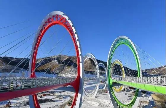 蓝、红、黄、绿、白,五个双层同心椭圆造型, 象征了奥运五环,这就是位于冬奥会崇礼赛场出口的冬奥“五环桥”,学名“延崇GQ3标太子城大桥”。