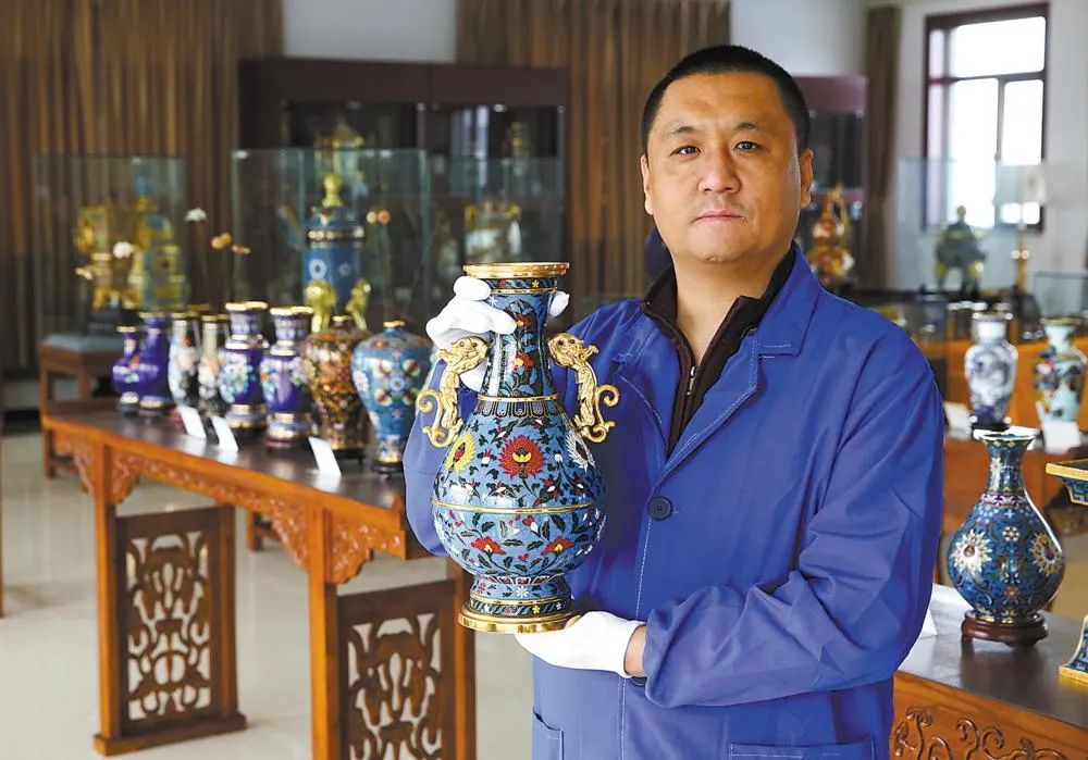 今年42岁的徐国伟是省工美协会会员、珐琅釉料烧造技艺省级传承人。1997年,徐国伟子承父业,继承了景泰蓝釉料烧制的核心工艺技术。20多年来,他潜心学习、传承、发展景泰蓝釉料这门有着600年历史的手工艺。在转型升级中,他创立了京锐景泰蓝有限公司(以下简称京锐),从单一的原料生产转型成为集原料生产、工艺研发、成品制作于一体的综合性生产企业。