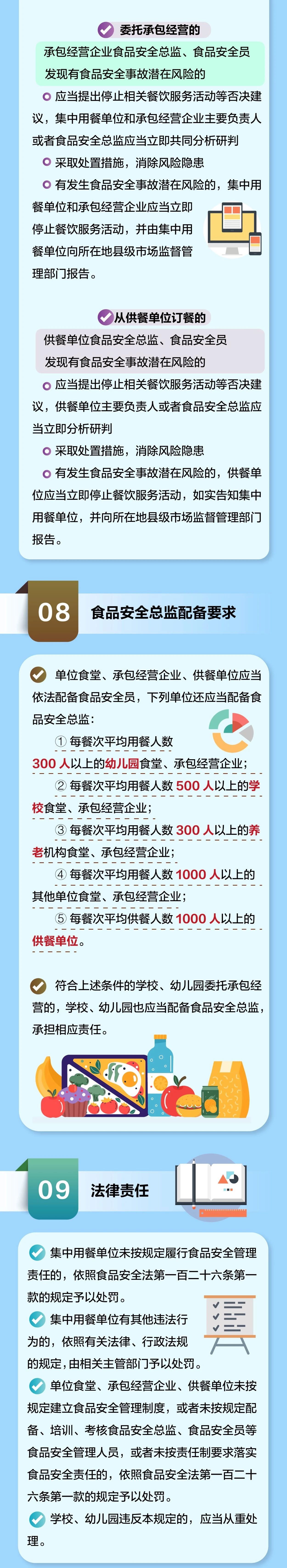 近日,市场监管总局发布《集中用餐单位落实食品安全主体责任监督管理规定》,自2025年4月15日起施行。学校、托幼机构、养老机构、医院、机关食堂等集中用餐单位食品安全是餐饮服务食品安全的重中之重,为督促集中用餐单位、单位食堂、承包经营企业、供餐单位落实食品安全主体责任,健全食品安全责任制,提高风险防控能力,维护群众饮食安全,市场监管总局将集中用餐单位落实食品安全主体责任的规定单独立法,制定出台《规定》。《规定》共27条,对集中用餐单位、单位食堂、承包经营企业、供餐单位,从责任分配、风险防控机制、食品安全管理人员配备和任职要求、法律责任等方面进行了规定。主要内容如下:一是强化集中用餐单位的食品安全管理责任。规定集中用餐单位应当依法加强对单位食堂、承包经营企业、供餐单位经营行为的管理;在确定承包经营企业、供餐单位时,须选择取得食品经营许可的企业;从供餐单位订餐的,须按要求查验所订购食品。明确集中用餐单位未履行食品安全管理责任的,应当依法予以处罚。二是明确单位食堂、承包经营企业、供餐单位的食品安全主体责任。规定单位食堂、承包经营企业、供餐单位应当建立健全食品安全管理制度,落实食品安全责任制,依法配备食品安全总监、食品安全员;同时,考虑到学校、幼儿园的特殊性,规定符合一定条件的学校、幼儿园委托承包经营的,学校、幼儿园也应当配备食品安全总监。规章规定单位食堂、承包经营企业、供餐单位须严格落实“日管控、周排查、月调度”工作制度。明确学校、幼儿园违反《规定》要求的,应当从重处理。三是完善各相关主体协同落实食品安全责任的工作机制。规章要求集中用餐单位应当与承包经营企业、供餐单位依法签订合同,明确双方在食品安全方面的义务,建立食品安全工作会商机制,定期交流沟通,共同排查和消除安全隐患,防范和管控食品安全风险;规定有发生食品安全事故潜在风险的,各相关主体应当立即停止餐饮服务活动,并按照规定报告。