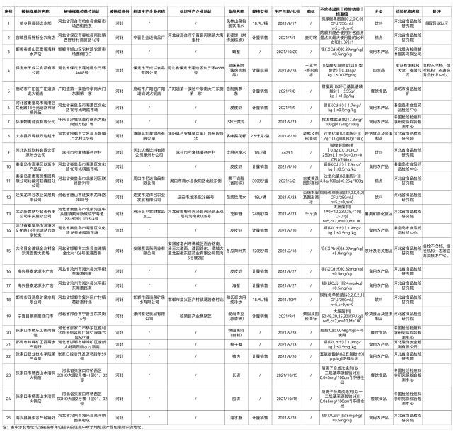 近期,河北省市场监管部门抽检饼干,餐饮食品,茶叶及相关制品,炒货食品及坚果制品,淀粉及淀粉制品,调味品,方便食品,蜂产品,糕点,酒类,冷冻饮品,粮食加工品,肉制品,食用农产品,食用油、油脂及其制品,薯类和膨化食品,水果制品,速冻食品,饮料等19类2379批次样品,检验合格2354批次,不合格25批次。