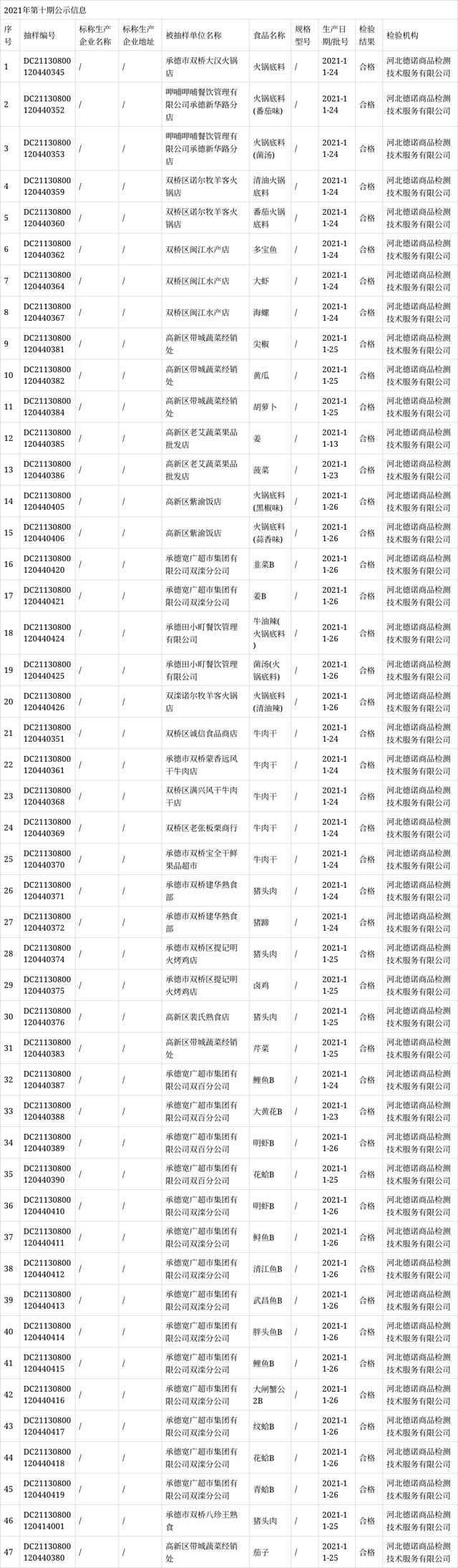 近日,河北省承德市市场监督管理局发布食品安全监督抽检情况公告(2021第10期)。本次发布的监督抽检信息涉及肉制品、餐饮食品、食用农产品等47批次样品,经检验全部合格。