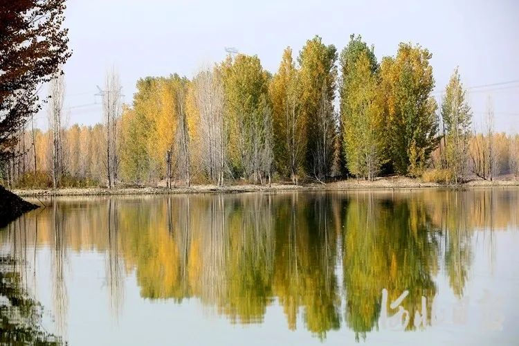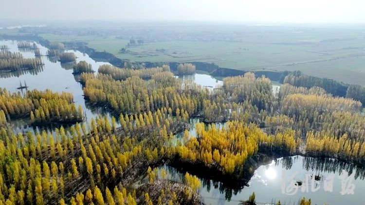 11月5日,泜河邢台市隆尧县双碑乡河段,河水清澈、碧波荡漾,河中心的一座座“小岛”上,一株株杨树整齐排列,黄色的树叶与水面相互映衬,勾勒出一幅浓浓的金秋图。