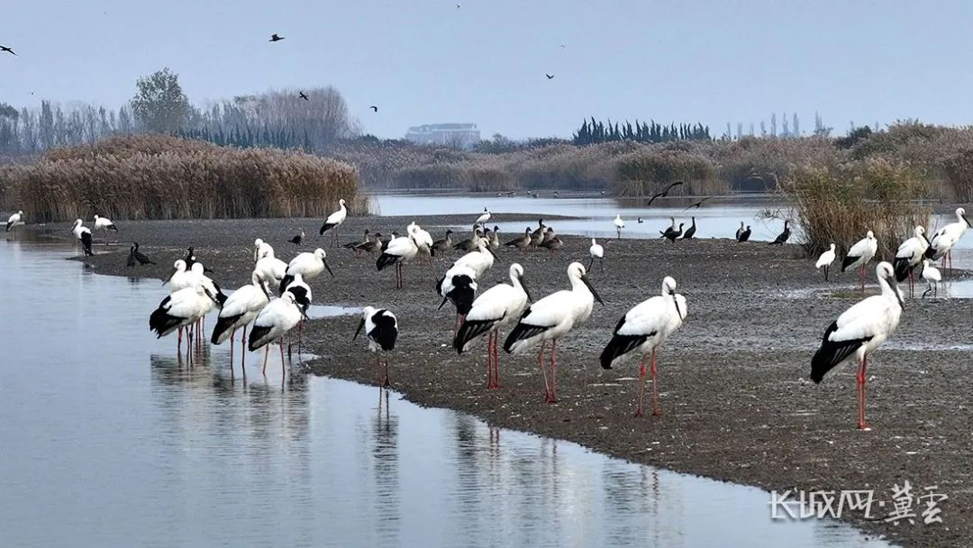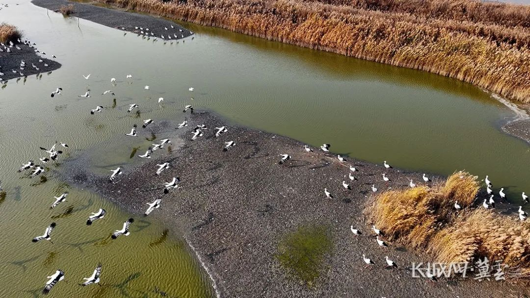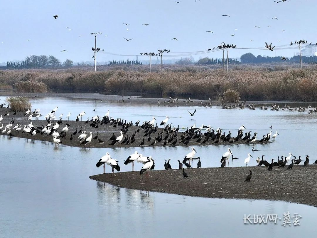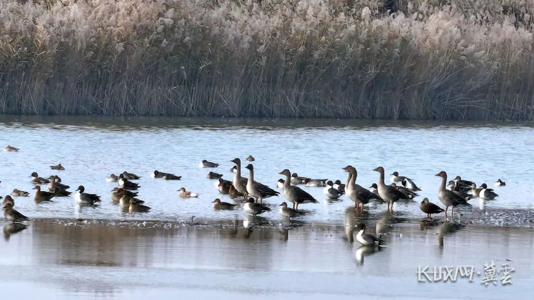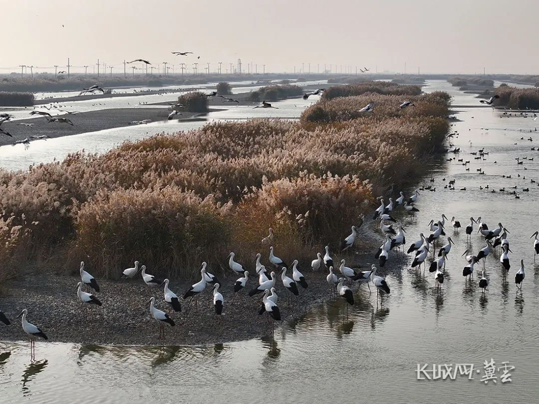 2024年10月下旬以来数万只由北向南迁徙越冬的珍稀鸟类路过曹妃甸湿地,在这里补充能量继续南行。