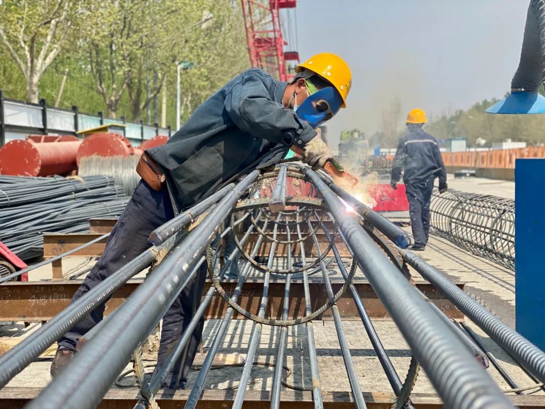 北京轨道交通平谷线河北段潮白大街站,工人正在绑扎钢筋。