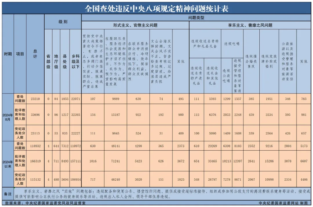 9月26日,中央纪委国家监委公布了2024年8月全国查处违反中央八项规定精神问题汇总情况。当月,全国共查处违反中央八项规定精神问题23210起,批评教育和处理33696人,其中党纪政务处分23113人,这是连续第132个月公布月报数据。综合施策治理违规操办婚丧喜庆问题