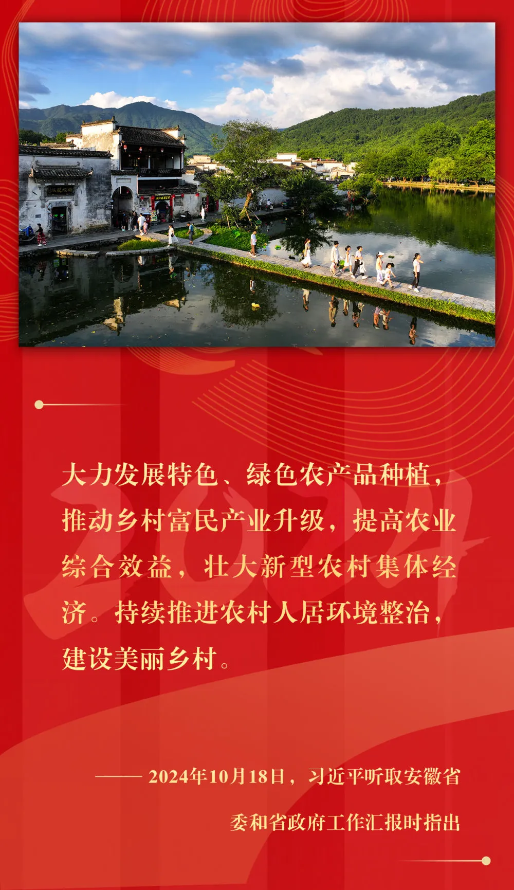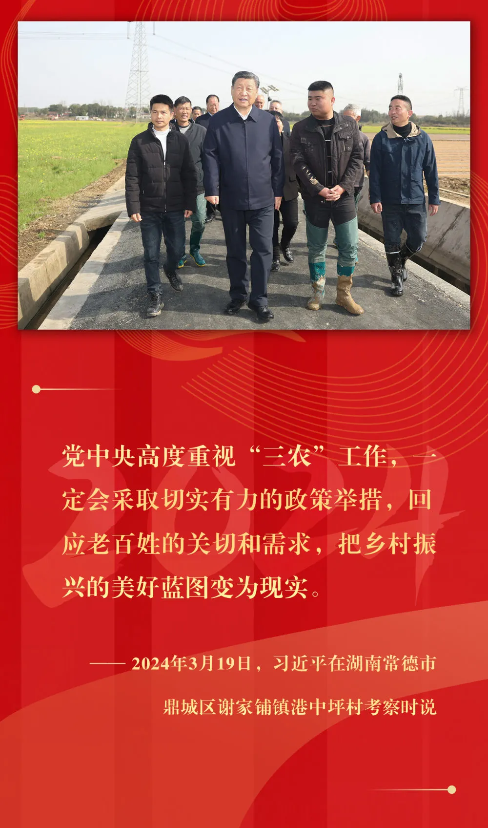 坚持城乡融合发展、持续深化农村改革、支持强农惠农富农、拓宽农民增收渠道、强化农业科技和装备支撑、确保粮食和重要农产品稳产保供……2024年,习近平总书记在基层考察期间,持续关注乡村振兴,多次提出重要指示,落子关键处、科学谋布局,千方百计推动农业增效益、农村增活力、农民增收入。